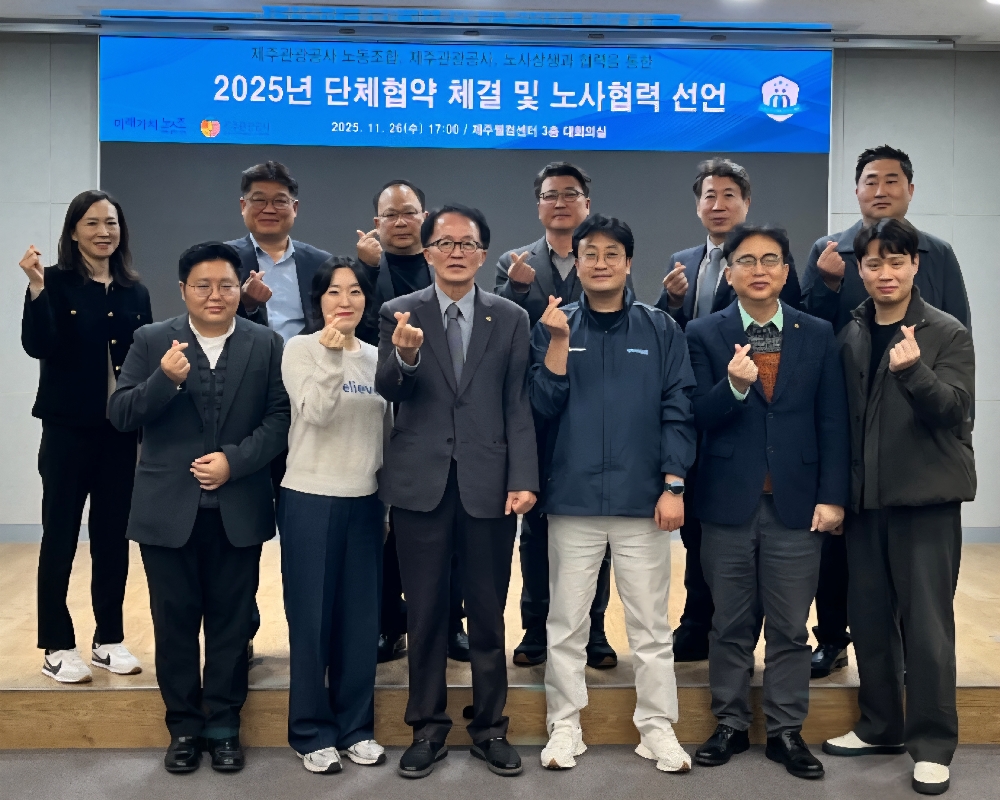 ○ 제주관광공사(사장 고승철)와 제주관광공사 노동조합(위원장 김성훈)은 지난 26일 제주웰컴센터에서 2025년 단체협약을 원만히 타결, 2회 연속 무분규·무쟁의 방식으로 평화적 협약을 체결했다고 27일 밝혔다.