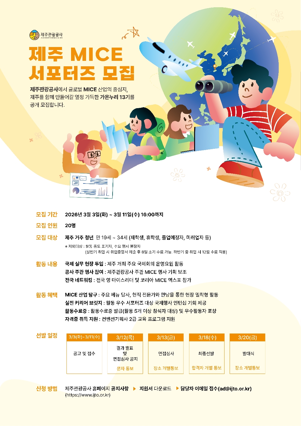 □ 모집 대상은 제주 도내 거주하는 대학생(재학·휴학·졸업예정자 포함) 및 미취업 청년(만 19세 ~ 만 34세)이다. 지원은 제주관광공사 홈페이지(www.ijto.or.kr) 내 공지사항에서 지원서를 내려받아 작성한 후 3월 11일 오후 4시까지 이메일(ad@ijto.or.kr)로 제출하면 완료된다.