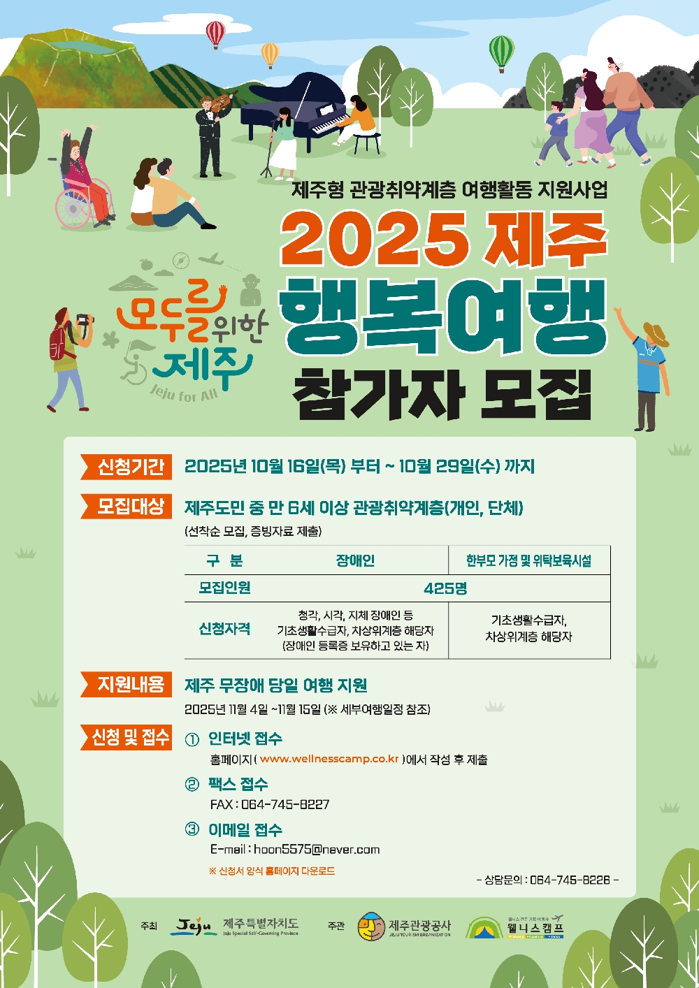 4) 모집대상: 공고일 기준 도내 거주 중인 제주도민 중 만6세 이상 관광취약계층(단체,개인)