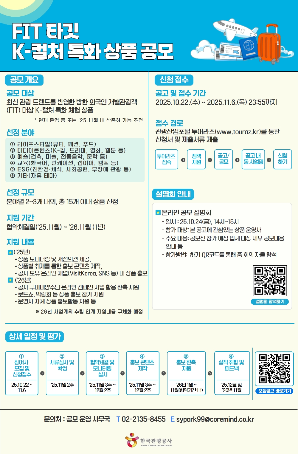 한국관광공사에서는 K-컬처 연계 관광상품 다양화를 통한 방한 소구력 제고를 위해 `FIT 타깃 K-컬처 특화 상품 공모`를 진행하고 있습니다.