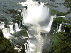 น้ำตกIguazuของบราซิล อาร์เจนตินา น้ำตกที่ขนาดใหญ่มากที่สุดในโลก น้ำตกทั้งหมด275ที่มาประกอบเป็นน้ำตกIguazuมีชื่อเล่นว่า 'คอปิศาจ'สูงประมาณ80mแถวนี้คุ้มครองป่าที่ยังไม่ได้พัฒนา เนื่องจากน้ำตกและป่าสวยงามมาก ทั้งบราซิลและ อาร์เจนตินาจึงปกป้องโดยจัดการเป็นอุทยานแห่งชาติ |